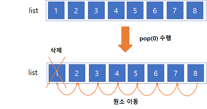 리스트의 마지막 원소를 삭제하는 경우에 대한 시간복잡도는 O(1)이지만, 아래 그림처럼 첫번째 원소를 삭제하는 경우 삭제 후 모든 원소를 앞으로 이동시키기 때문에 시간 복잡도가 O(n)이다.