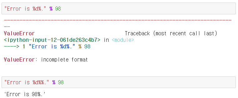 문자 %를 나타내고 싶을 때는 %%포맷 코드를 사용해야 한다.