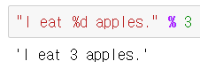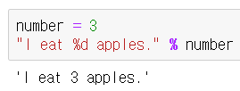 문자열 안에서 숫자를 넣고 싶은 자리에 %d 문자를 넣어 주고, 삽입할 숫자는 문자열 밖에 % 문자 다음에 넣는다.