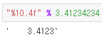 3.421234234를 소수점 네번째까지만 나타내고 전체 길이가 10개인 문자열 공간에서 오른쪽으로 정렬한 것이다.