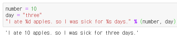 문자열 안에 또 다른 문자열을 삽입하기 위해서는 문자열 포맷 코드 %d가 아닌 %s를 사용해야 한다.