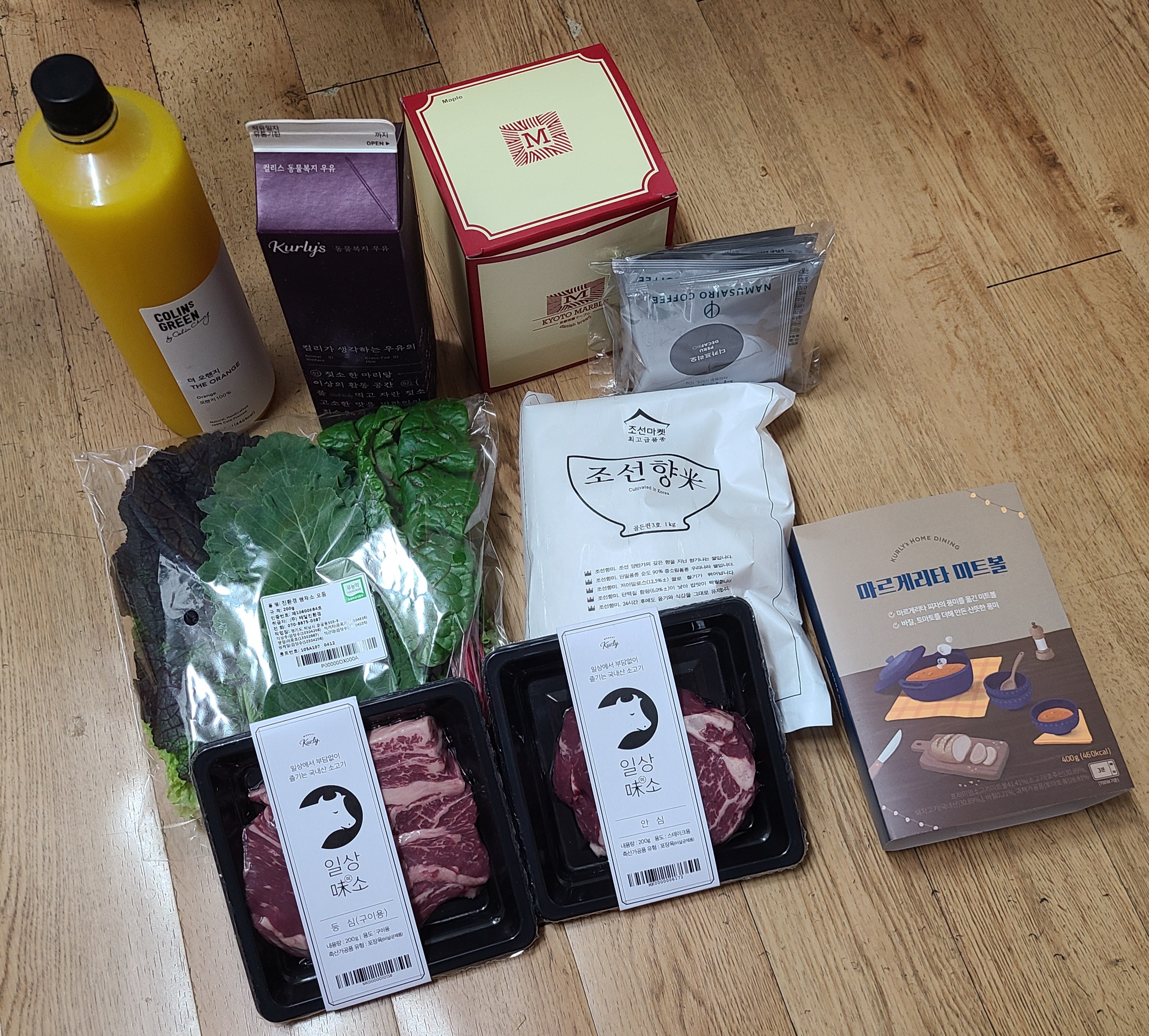 오렌지 주스, 시나몬 식빵, 안심&등심, 미트볼, 상추, 쌀, 커피, 그리고 우유가 들어있었다.