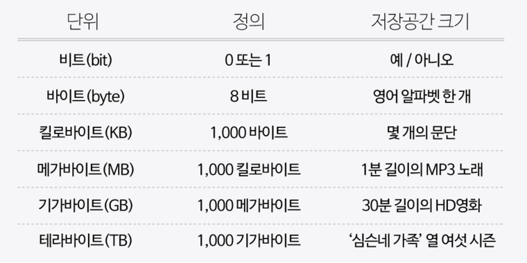 바이트가 모이면 더 큰 단위가 될 수 있습니다. 킬로바이트는 1,000 바이트, 메가바이트는 1,000 킬로바이트(100만 바이트), 기가바이트는 1,000 메가바이트(10억 바이트)입니다. 테라바이트는 1,000 기가바이트(1조 바이트)이며, 심지어 페타바이트와 엑사바이트와 같은 더 큰 단위도 존재합니다.