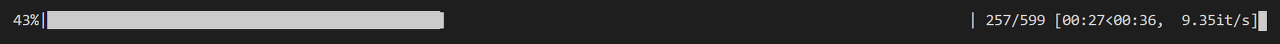 위의 진행상태에 대한 정보에서 43%는 진행률, 257/599는 전체 599번 중 현재 257번째 작업 수행중, 00:27<00:36은 전체 작업 완료까지 남은 시간은 36초이며 현재 27초 경과되었다는 것, 9.35it/s는 1초당 평균 9.35번의 반복을 수행했다는 것에 대한 정보다.
