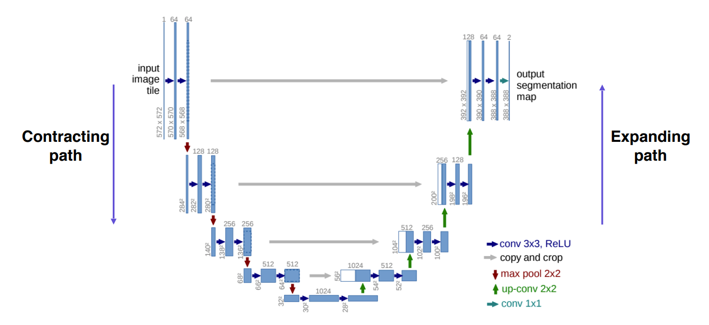 - Contracting path (일반적인 CNN과 동일)