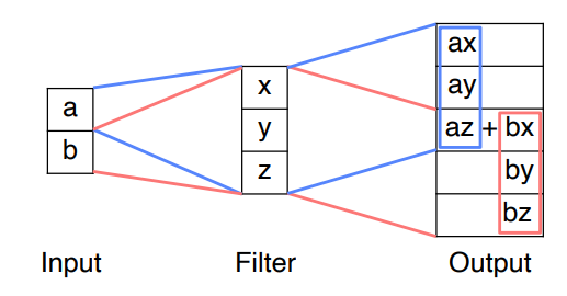 - a, b 두 개의 입력이 주어졌을 때 transposed convolution은 필터를 scaling 한 것을 해당하는 출력위치에 붙여놓는다.