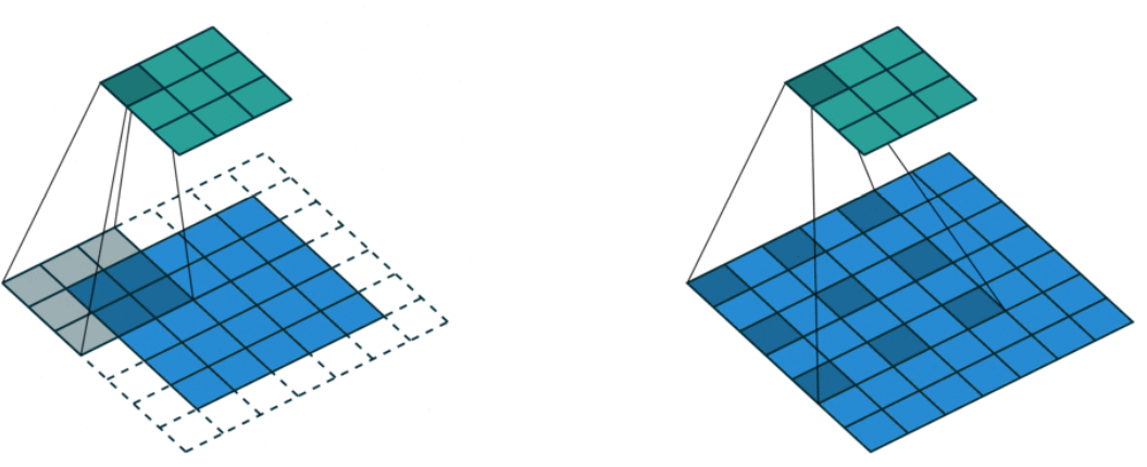 - 아래 오른쪽 dilation convolution 같은 경우는 weight 사이를 한 칸씩 띄어서 실제 convolution kernel 모다 더 넓은 영역을 고려할 수 있게 만든다