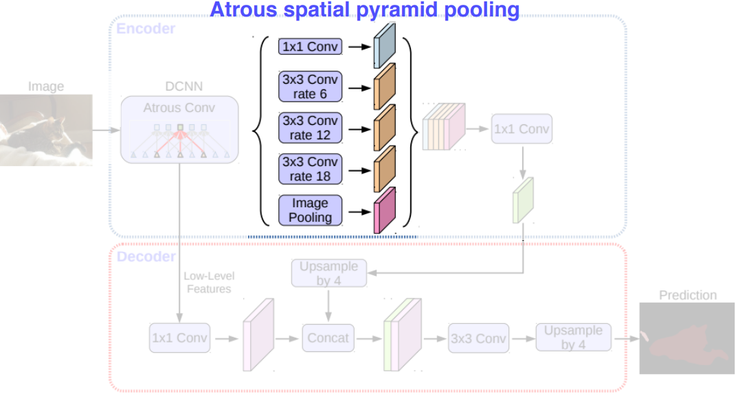 - 영역별로 연관된 주변 물체 또는 배경 정보의 거리가 모두 다르므로 다양한 rate의 dilated convolution을 통해서 multi scale 을 처리할 수 있는 spatial pyramid pooling을 구현