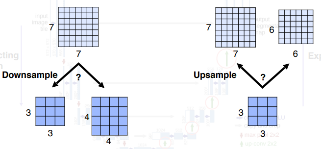 - 오른쪽 : 3x3 된 feature map을 다시 두배로 upsampling 하게 되면 7x7로 돌아가지 않고 6x6이 된다