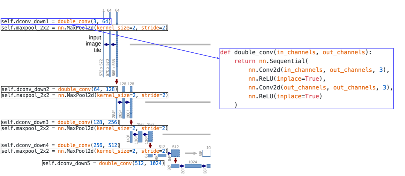 - 각 contracting path에서는 double_conv 블록 한 번과 그 끝에 max pooling을 통해 해상도를 절반씩 줄이고 채널을 늘린다.