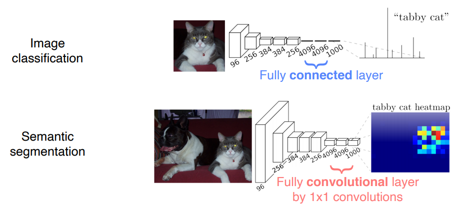 - FCN(Fully Convolutional Networks)은 입력이 activation Map 즉, tensor이고 출력도 acitvation Map형태로 나온다. 즉, spacial coordinate를 유지한 상태로 operation이 수행되는 layer이다. 그리고 보통 1X1 Convolutional layer로 구현이 된다. 각 위치마다 classification 결과를 출력하는 map형태로 출력이 정해지게 된다.