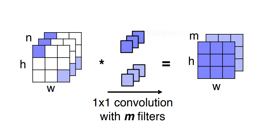 - 채널 축으로 1x1 convolution 커널이 fc layer의 한 weight 칼럼이라고 볼 수 있다
