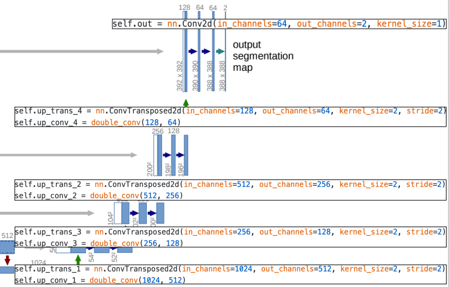 - 한 번에 upsampling 하는 대신에 점진적으로 단계별로 activation map의 해상도를 올려주고 채널 수를 절반으로 줄인다 (Repeatedly applying 2x2 convolutions and Halving the number of feature channels)